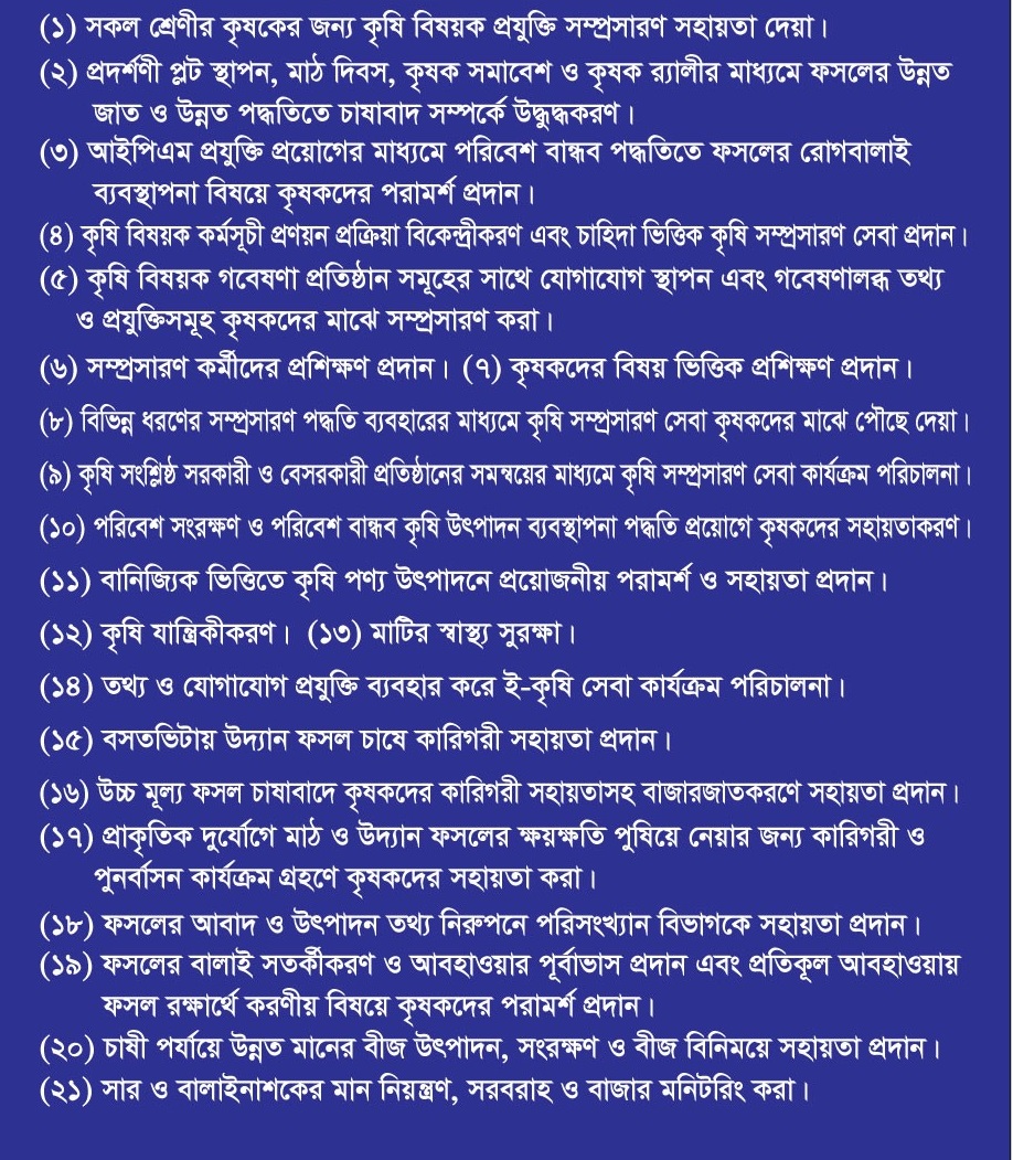 ১.সকল শ্রেণির কৃষক/ উদ্যোক্তাগণকে কৃষি বিষয়ক পরামর্শ প্রদান ।